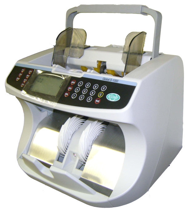 The Ribao Global D-1000 Multi-Detection Currency Counter is a full featured currency counter and discriminator that will meet the needs of any small business or bank. The D-1000 is a one-pocket discriminator that will halt operation in the event that it finds a bill that doesn't match your count settings. For instance if you're counting $1 bills and a $10 bill is located in the stack it will stop and allow you to remove the $10 bill so that you can continue operation for the remainder of the bills. This machine is capable of counting currency at an adjustable rate of up to 1,600 notes per minute. It has three counting modes to suit your needs: mixed counting, mixed sorting, and piece counting. It also features three different counterfeit detection systems such UV (ultraviolet), MG (magnetic), and IR (infrared) to find prevent those false bills from slipping through. The Global D-1000 is small and portable so you can take it where it is needed most. Other features include a blue backlit LCD screen, preset and manual batch settings, intelligent detection of misfeeds, and manual value input of worn bills. Ribao offers a 90 day parts and labor warranty. |